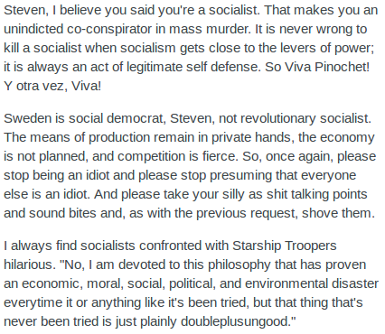 Steven Schwarz/imnotandrei then proceeds to try to point out how no good, very bad, horrible, double-plus-ungood LTC Tom Kratman is by accusing him of supporting the pre-emptive killing of socialists, quoting a comment from one of his EveryJoe columns: