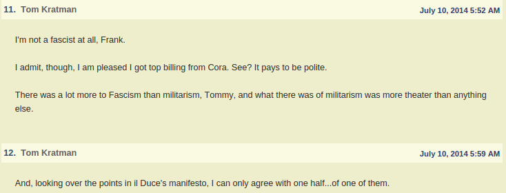 And here is LTC Kratman’s “vigourous defence” of Italian Fascism at EveryJoe:
