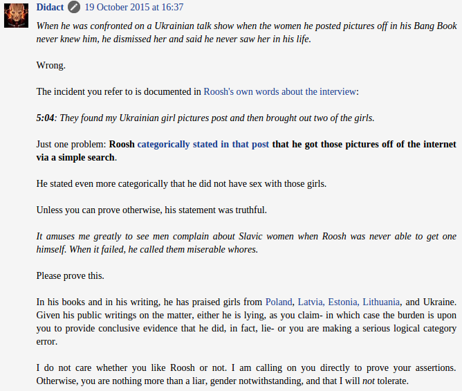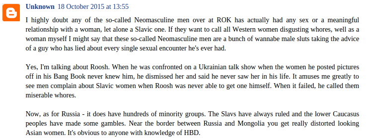 So essentially, the claims that “Unknown” makes about Roosh’s character are baseless. Even the most cursory examination of the evidence contradicts her claims- I assume, until shown otherwise, that “Unknown” is a woman, based on the second sentence of her own comment.