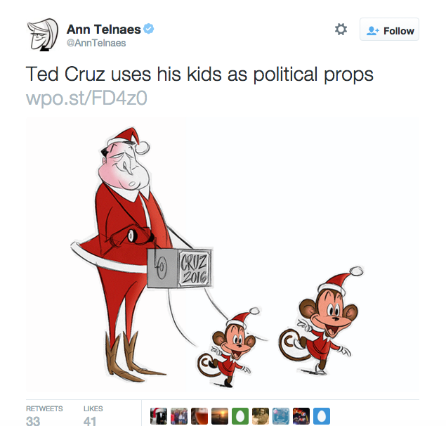 Yeah. That’s what a cartoonist for the Washington Post considers to be acceptable political satire- painting two adorable little girls from what appears to be a happy and stable family as monkeys dancing to their dad’s tune.