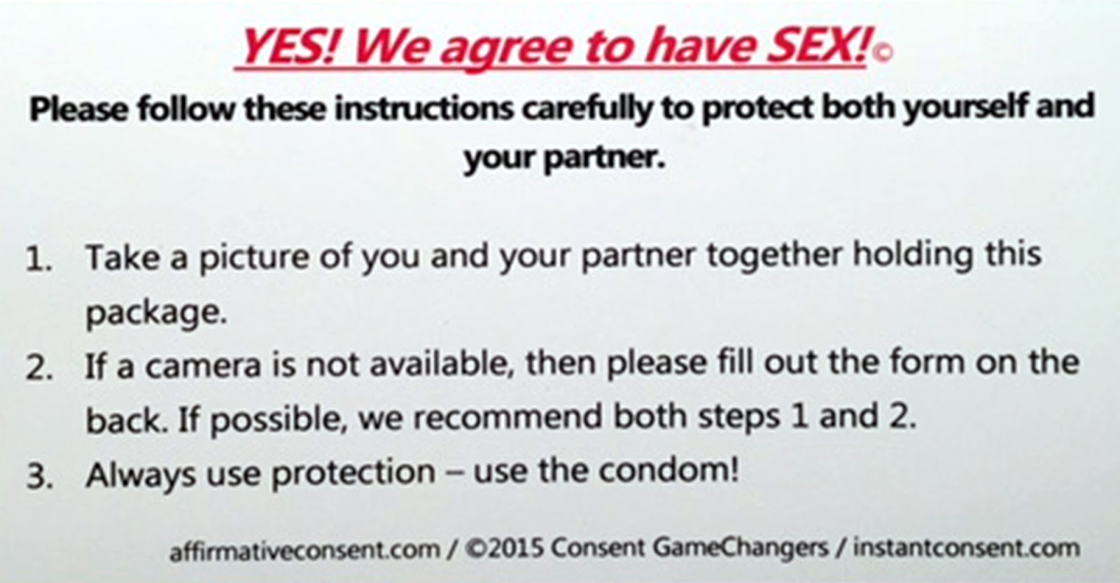 There is actually a serious point to be made here about how ridiculous it is that sexual relations in advanced Western societies have gotten to the point where forms have to be filled in for men and women to do what comes most naturally to us. Sex is supposed to be a fun, pleasurable act that has a serious reproductive purpose. It was never supposed to be turned into this dry, cold, impersonal act of rubbing genitalia together with written consent by both parties.