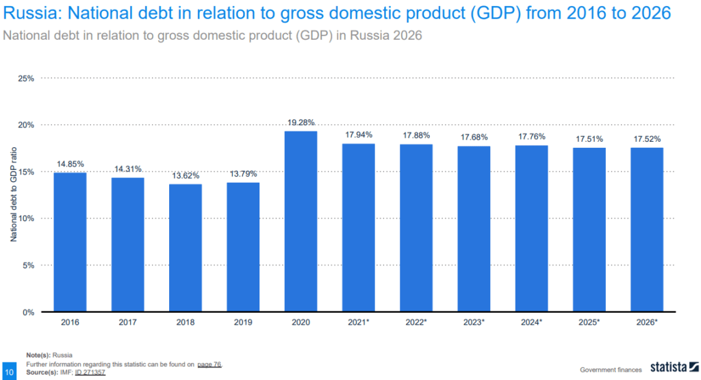 - Russia’s share of debt-to-GDP is under 20% – well under, in fact – which means that sanctions cannot harm it substantially, as it is not a highly leveraged economy like the USA, Japan, or even China;