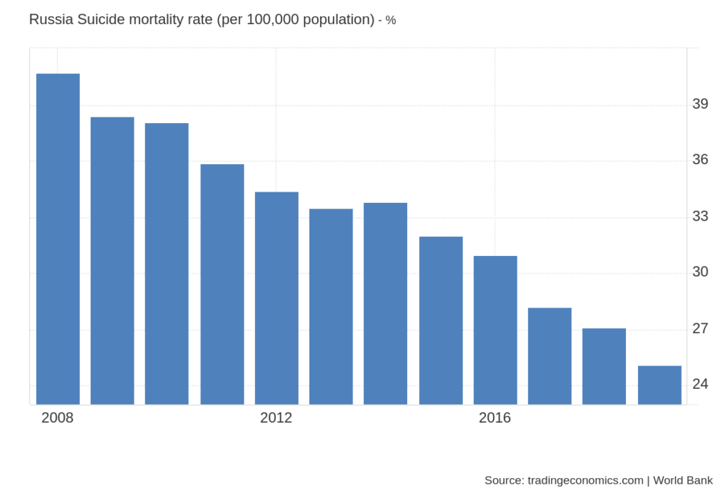 However, you have to look at the trend over time as well. And the trend is very clear. Suicide rates have been declining consistently in Russia for many years. (Don’t be deceived by the “percentage” presented in that link. In reality, they are numbers per 100K.)