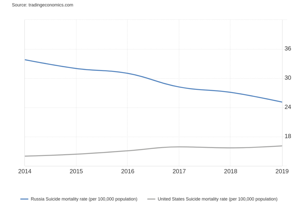 Assuming we can trust World Bank and WHO data (which is a shaky proposition, at best), it is true Russia continues to have one of the highest suicide rates in the world – currently, it ranks 9th out of all nations, and its suicide rate of 25.1 for every 100K inhabitants is substantially higher than the US’s 16 per 100K.