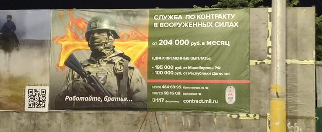 That poster says that residents of St. Petersburg will receive 5M rubles in the first year of service, with a one-time payment of 2.5M rubles, and a monthly salary of 210K rubles. The main caption of the poster reads, “Of the Hero-City – Our Heroes”, with a play on the Russian reflexive preposition, Свои (“ours”, or “our own”), against the acronym СВО (Специальная Военная Операция – literally, “Special Military Operation”).
