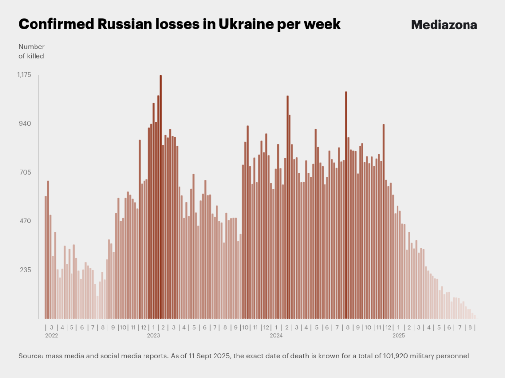 In fact, the Mediazona data show a steep downward trend in Russian losses ever since about a year ago. Where the Russians were once losing 800-1,000 men every week, they are now losing 100-150 men.